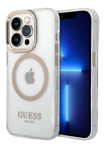 Накладка Guess для iPhone 15 Pro Max PC/TPU Metal outline Hard (MagSafe), Transparent/Gold (GUHMP15XHTRMD)