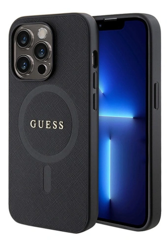 Накладка Guess для iPhone 15 PU Saffiano with metal logo Hard (MagSafe), Black (GUHMP15SPSAHMCK)