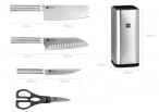 Так как рукояти ножей полые, уменьшается вес самих ножей. Из-за уникальной центровки всех ножей, вам не придется прикладывать много усилий для резки мяса или овощей. Даже при длительном пользовании ножами вы не устанете пользоваться ими, так как рукоять устроена особым образом. Нож для нарезки ломтиками с легкостью нарежет овощи, морепродукты и мясо. Нож для фруктов равномерно очистит кожуру с фруктов и удобно нарезать дольками. Нож для рубки мяса подходит для рыбьих, птичьих костей, а также для мяса на кости (ребрышки, баранина, антрекот). Ножницы с орехоколом для разделки различного мяса, креветок и других морепродуктов. Подставка для ножей и ножниц выполненная из прочного ABS пластика и нержавеющей стали.