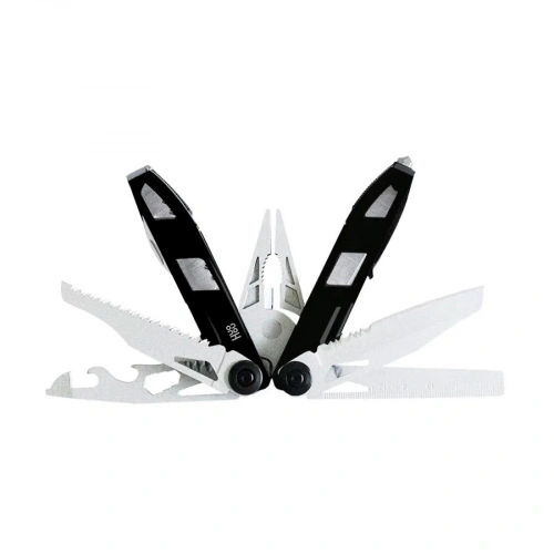 - Инструмент: Пассатижи, кусачки, держатель бит, линейка, нож, пила, отвёртка плоская, отвёртка крестовая, консервный нож, открывашка для бутылок, шестигранник, гнездо для бит, нож для ремня, стропорез, стеклобой, напильник, стриппер, стопор, зубчатая выемка