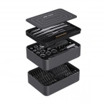 Благодаря компактной конструкции корпус набора разделен на 3 модуля, которые после складывания образуют единое целое, удобное для переноски и хранения. Такой набор можно легко перевозить в автомобиле, он поместится в вашем рюкзаке или в большом ящике для инструментов. Корпус изготовлен из прочного АБС-пластика и покрыт металлизированной краской для повышения эстетичности.